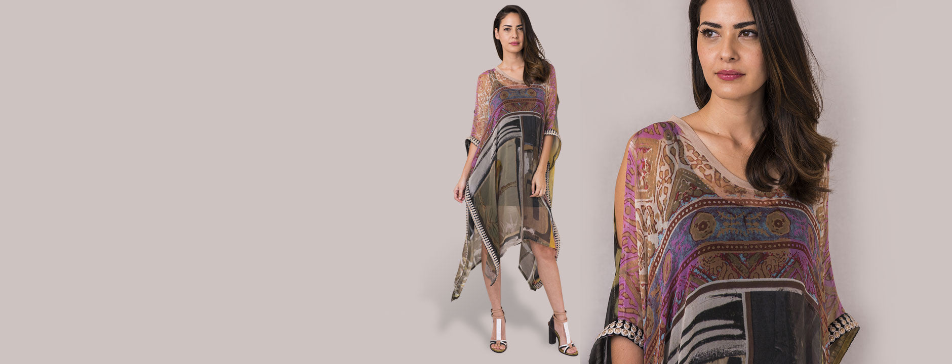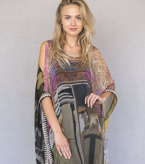 The "World Tapestry Kaftan" is beautiful, elegant and flattering. Featuring everything from birds and fish to asian waves, gypsy prints, and abstract art.